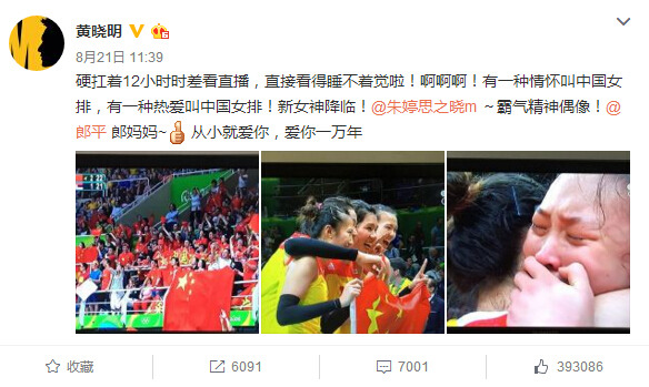 ロック歌手の汪峰(ワンフォン)は、「?jìng)ゴ螭逝鹰啸飑`選手たち」とのタイトルで、「永遠(yuǎn)の輝き、感動(dòng)の涙とは何だろう?。郡饯未黏à悉氦肖瓯伺郡?!この90後(1990年代生まれ)の選手たちが中國(guó)人みんなに、一生懸命奮闘し勝利することの喜びと感動(dòng)を體験させてくれた!神様みたいな郎平監(jiān)督よ!彼女は何十年もの間、夢(mèng)を毎分毎秒、現(xiàn)実にしてくれ、中國(guó)人に誇りを感じさせてくれ、世界が中國(guó)に敬服した!」と書き込み、妻で女優(yōu)の章子怡(チャン?ツィイー)もその微博を転送し、「中國(guó)女子バレーチームに歌を作ってあげて!」と夫の汪峰に催促していた。