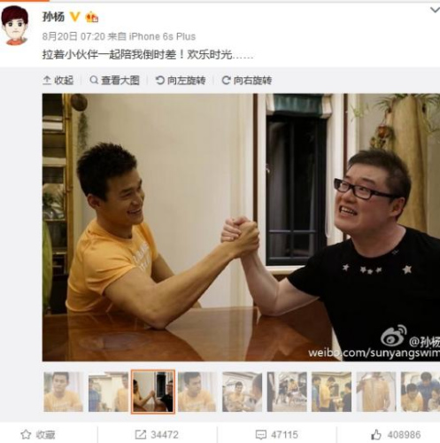 腕相撲をしたり、友人が片手腕立て伏せをするのを督促したり……。帰國後、時差ボケもまだ解消しない孫楊選手は、おちゃめな一面を見せた。今回、その“被害者”は、孫選手に付き添っていた良き友人たち。こんなに大勢の人に囲まれ、孫選手もご機嫌の様子で、微博(ウェイボー)に投稿された畫像一枚一枚に、自分の友人を誇らしげに思う気持ちがよく現(xiàn)れている。そのたくさんの畫像は、孫選手が幼い心を持つ“いたずらっ子”であることを示している。