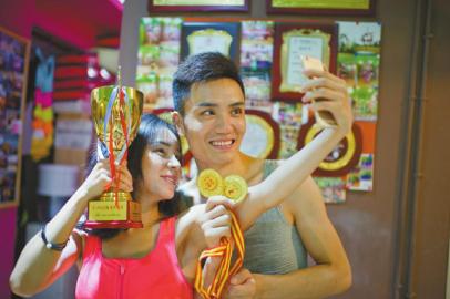 王さんが獲得したトロフィーやメダルと一緒に寫真を撮る生徒と王さん。