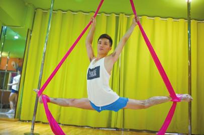 王さんはポールダンスだけでなく、天井から吊るした長い布やフープを使って空中で行う、エアリアルも得意とする。
