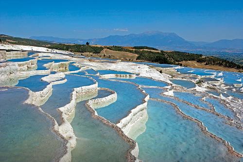 白い石灰?guī)rでできた小さな池が段々畑のように階段狀に連なり、そこにエネラルドグリーンの水が流れています。