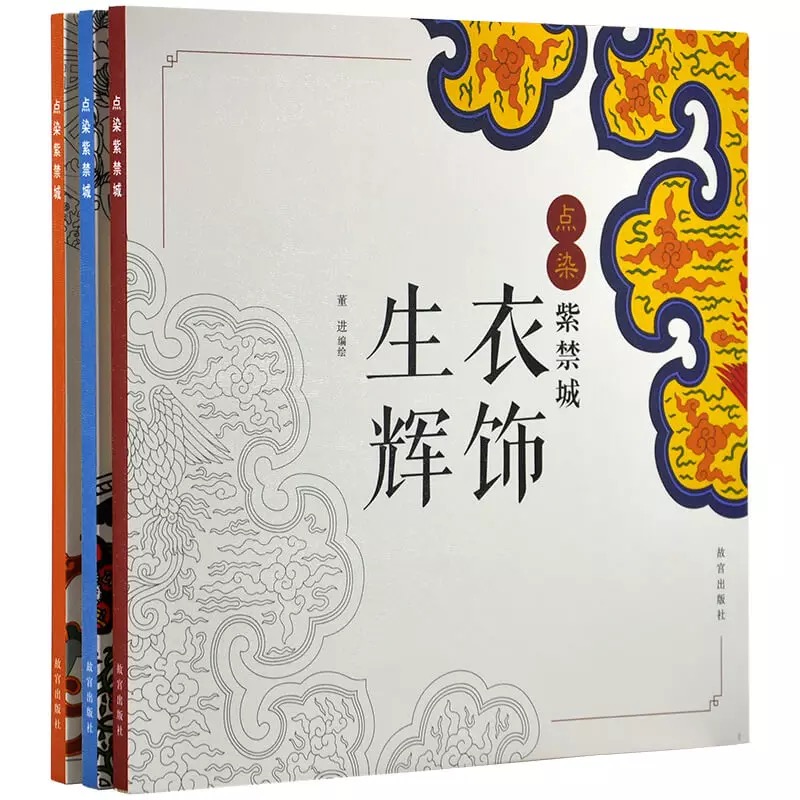「點染紫禁城」は「器用流光」、「衣飾生輝」、「雕梁▼(▼は火へんに奐)彩」の3冊が一セットで、それぞれ宮廷の美しい器物や服飾、建築物を色付けするという內(nèi)容になっている。全ての図案が故宮にあり、各図案の背後にも物語がある。「衣飾生輝」の1番目の図案を例にすると、明成化団龍紋補子をモチーフにした円形の図案が描かれており、明朝の第9代皇帝?成化帝の肖像畫から取られた。専門家によると、団龍紋飾は形のバランスが非常に整っており、幅広く応用されている。また、この図案は明?清の時代の官服制度において、高い身分の象徴でもあった。