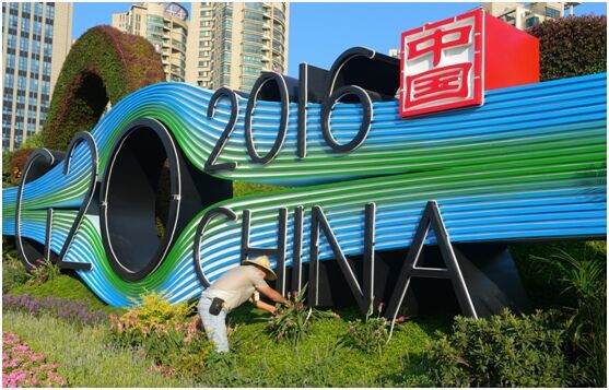 8月25日、造園技術者が杭州市浜江區(qū)江南大道街でG20サミットの花壇の手入れをする様子。11回目となる今回のG20サミットは、9月4?5日に浙江省杭州市で開催される。