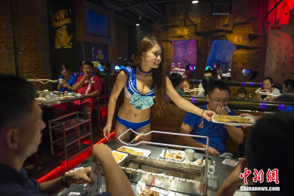 28日夜、海南省海口市のある焼肉レストランではセクシーなビキニ姿のウェイトレスが忙しく駆け回り、お客さんから注文をとったり、料理を運(yùn)ぶなどの行き屆いたサービスを提供していた。中國新聞網(wǎng)が伝えた。(編集YK)