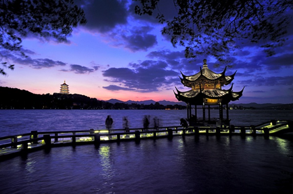 夕焼けにくっきり映し出される塔の美しい姿から「雷峰夕照」の名で有名な西湖十景の一つ