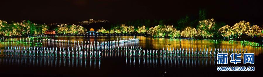 この幻想的なパフォーマンスはどのように行われたのだろうか?演出を手がけたスタッフによると、舞臺用ライトは晝間のうちに西湖の水中に沈めておき、夜に上演する際に船で引き上げたということだ。幾筋もの光の束が集まってから四方へ散り、湖岸の木々や遠くの山々が無數(shù)の光で照らされ、四季折々の木々の様子を次々と映し出していた。