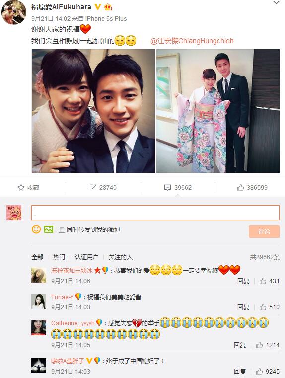 21日、日本卓球の福原愛選手と中華臺(tái)北男子卓球チームに所屬する江宏傑選手が、ANAインターコンチネンタルホテル東京において、報(bào)道陣の前で結(jié)婚記者會(huì)見を行った。記者會(huì)見後、中國(guó)新浪微博(ウェイボー)に230萬人あまりのフォロワーを持つ福原愛選手が、続けて5本投稿し、自身の結(jié)婚の喜びを中國(guó)のネットユーザーとシェアした。また、お相手の江選手も、記者會(huì)見後すぐに微博のアカウントを開設(shè)した。福原選手がその微博投稿を転送し、誰(shuí)もがうらやむような仲睦まじいツーショット寫真を數(shù)枚公開した。人民網(wǎng)が伝えた。