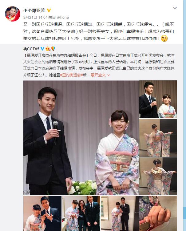 劉監(jiān)督だけでなく、前世界チャンピオンの■亜萍選手も、福原選手に対して、「卓球が縁でまた一組のカップルが誕生した。卓球を通じて知り合い、卓球を通じて愛(ài)し合う理由は、卓球が安いからだ(ああ!すみません!実はこの臺(tái)詞はあまりにも練習(xí)しすぎてついつい言ってしまうのです)。素晴らしい美男美女のカップル誕生を祝うと共に、お二人の幸せを心から祈っています。美男美女になりたければ卓球を始めましょう!」と祝福のコメントを贈(zèng)った。