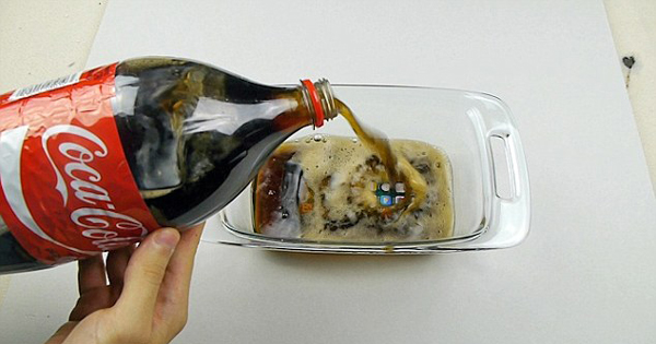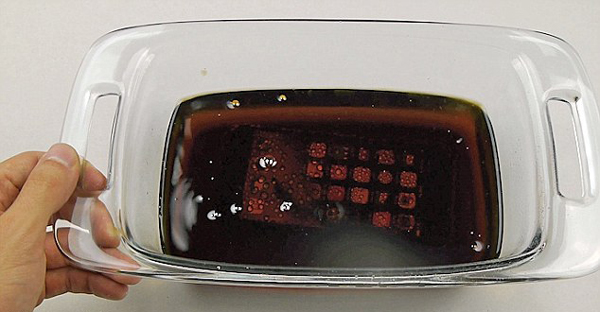 まず初めにiPhone7をコーラがたっぷり入った器の中に漬け込んだ。