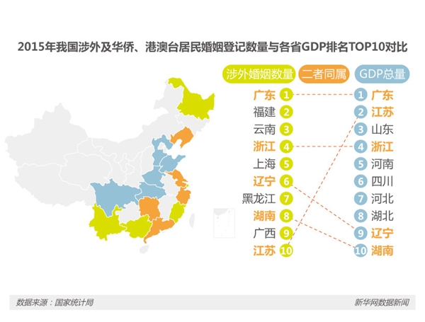 國際結(jié)婚は、文化の衝突と融合が起こるだけではない。あらゆる結(jié)婚と同じく、結(jié)婚生活を続ける上で、ある程度の物質(zhì)的基盤が必要だ。それでは、「経済的に豊かな」地域では、國際結(jié)婚がより多いのだろうか?統(tǒng)計データによると、外國人、華僑および香港?澳門?臺灣地區(qū)住民との婚姻件數(shù)ランキング上位10省(自治區(qū)?直轄市)において、GDP総額が全國トップ10に入っている省(區(qū)?市)の割合は半數(shù)にとどまった。このことから、國際結(jié)婚は「裕福な」人だけに起こる現(xiàn)象ではないことが分かる。