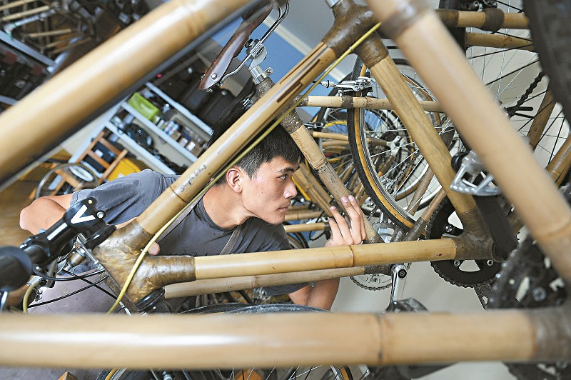 竹製の自転車は普通の自転車に比べて、作る過程での二酸化炭素排出が少なく環(huán)境に優(yōu)しい。タイヤやホイールなどのパーツは普通の自転車と同じだが、フレームやハンドルは竹で作られており、斬新でおしゃれな見た目で、レトロな雰囲気も放っている。材料の選定、焼き入れ、ブラッシング、組み立てなどの工程を行い、冷さんは約30時間かけて1臺の自転車を作り上げる。