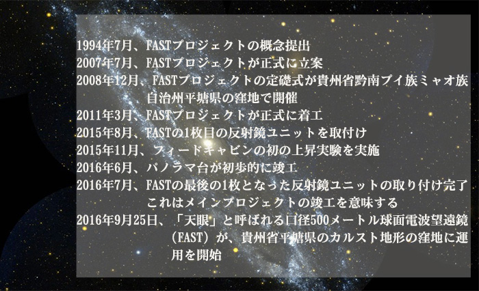 FASTは、2007年末に正式にプロジェクトが立案され、2011年3月に著工された。建設(shè)期間は5年半に達(dá)し、2016年9月25日に稼働を始めた。>>詳細(xì)へ