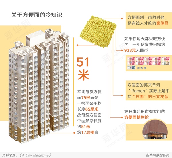 インスタント麺一袋あたり79本の麺が入っている。麺1本の長(zhǎng)さは平均65センチメートル、1袋合わせると約51メートルになり、17階建ての建物の高さに相當(dāng)する。