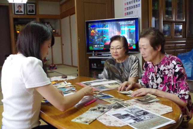 寫真を見(jiàn)ながら、學(xué)生記者?原子奈津?qū)gさん(寫真左)に、青森市の自宅で曽祖父母の思い出を語(yǔ)る祖母(寫真中央)と大叔母。