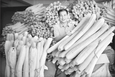 初めて収穫された宇宙ヘチマを見(jiàn)せてくれる江西美爾絲瓜絡(luò)有限公司総経理と科學(xué)技術(shù)の普及により全國(guó)の農(nóng)村を豊かにするプロジェクトの擔(dān)當(dāng)者である黃有水氏。