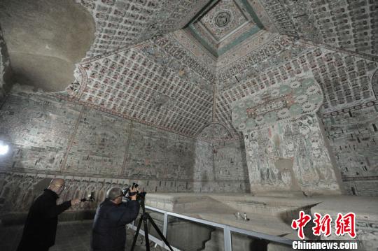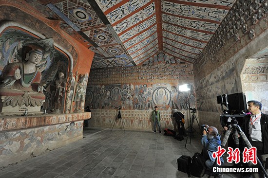莫高窟の洞窟內(nèi)で撮影を行い、蕓術(shù)作品の創(chuàng)作をするカメラマンたち。