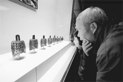 江西省博物館を訪れ、前漢の編鐘(打楽器)を鑑賞する來館者(10月11日撮影)。