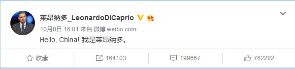 米人気俳優(yōu)?レオナルド?ディカプリオがこのほど、微博(ウェイボー)のアカウントを開設(shè)。初ツイートで、「Hello、 China!僕はディカプリオ 」と、中國のフォロワーに挨拶した。スーパースターの力は大きく、このツイートは、國慶節(jié)(建國記念日、10月1日)連休明けで、5月病ならぬ10月病にかかっているネットユーザーらに元?dú)荬蚺cえ、ここ數(shù)日でフォロワーの數(shù)が125萬人に達(dá)した。北京日?qǐng)?bào)が報(bào)じた。