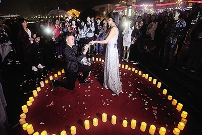 ちょうど1000日前、二人はそれぞれ新郎新婦の付添い人として出會った。女性は従姉妹の結(jié)婚式で、見ず知らずの付添い人である彼女を乾杯の攻撃から身を挺して守ってくれたその男性とたちまち戀に落ち、二人はその後まもなく付き合いを始めた。その日からちょうど1000日目を迎えた今月12日、女性は大型ディスプレイに求婚のメッセージを映し出し、その男性に大膽なプロポーズを行った。重慶市南濱路の煙雨公園で行われたこのプロポーズに、その場に居合わせた通行人の多くが足をとめ、「また愛を信じられるようになった」とこのロマンチックなサプライズを喜んだ。重慶晨報が伝えた。(編集TG)
