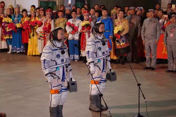 17日明け方4時40分頃、有人宇宙船「神舟11號」の宇宙飛行士出征式が、酒泉衛(wèi)星発射センター圓夢園広場で開かれた。人民網(wǎng)が伝えた。