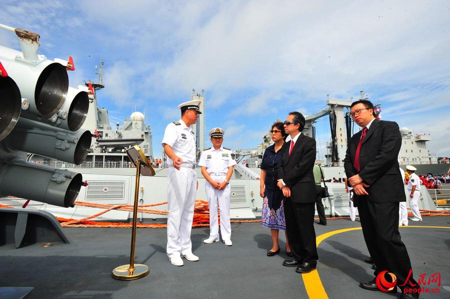 同日午後、艦隊(duì)の王紅理指揮官はカンボジア海軍司令官及びシアヌーク省知事を表敬訪問した。カンボジア海軍司令官は舟山と巣湖を見學(xué)。甲板レセプションにも出席した。艦隊(duì)指揮官は訪問中、カンボジアの副首相兼國防相、カンボジア王家軍総司令官などカンボジア軍上層部を表敬訪問する。