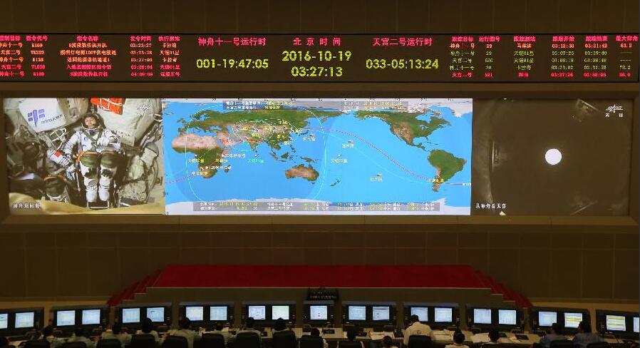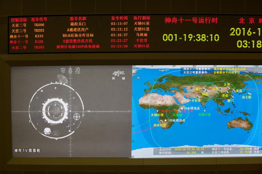 北京航天飛行制御センターがドッキング準備狀態(tài)の最終確認後を行うと、神舟11號は天宮2號に徐々に接近した。午前3時24分に神舟11號と天宮2號のドッキング裝置が接觸し、手順に基づき一連の操作を完了後、裝置にロックがかけられた。これにより、宇宙船同士がしっかり連結し、一つになった。