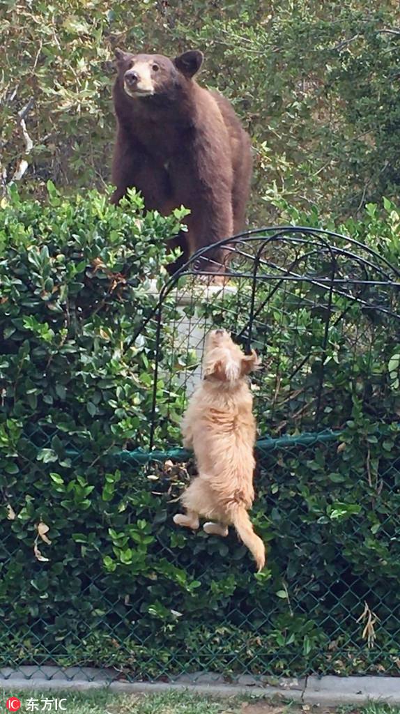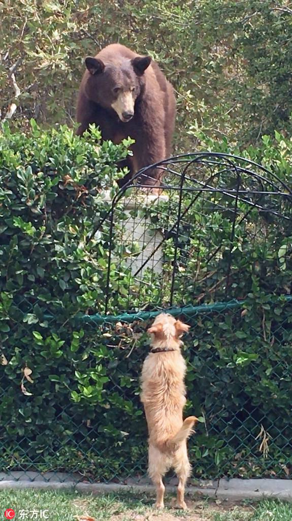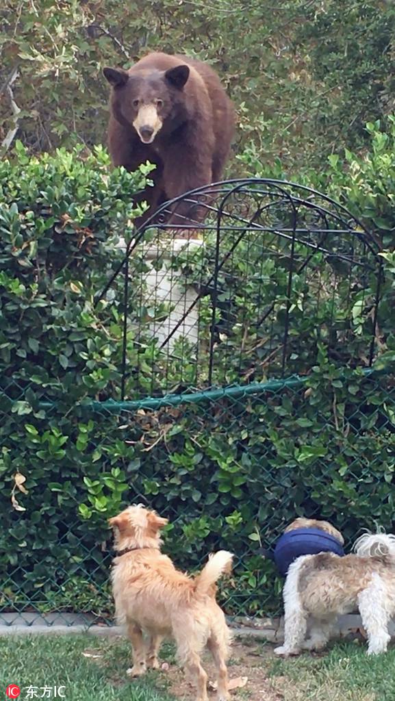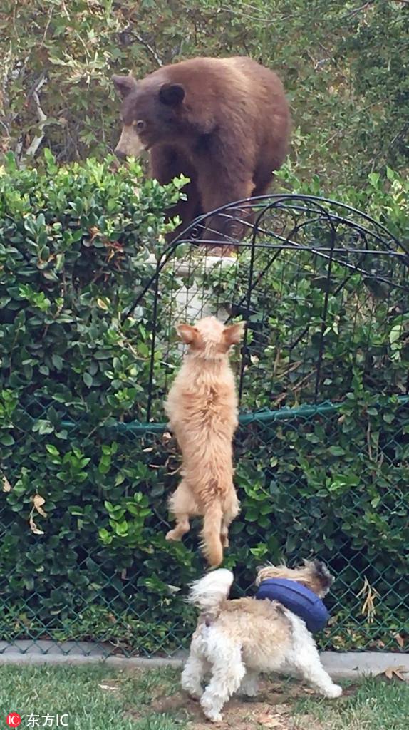 米カリフォルニア州で、このほど一頭の灰色グマがクリスティーン?ダウンズさんの家の裏庭に入り込んだ。ダウンズさんの2匹の飼い犬であるベントレーとタッカーは灰色グマにも全く物怖じした様子をみせなかった。2匹は侵入してきた灰色グマに果敢に立ち向かった。ベントレーは飛び跳ねて自分を強(qiáng)そうに見せ、灰色グマを威嚇した。結(jié)局、2匹は怖いもの知らずといった様子で、灰色グマはつまらなそうにその場を後にしたという。寫真はクリスティーン?ダウンズさんが撮影。人民網(wǎng)が伝えた。 (編集YK)
