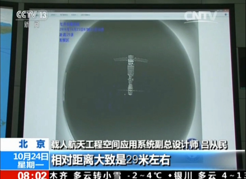 有人宇宙事業(yè)空間応用システム副チーフデザイナーの呂従民氏によると、これは衛(wèi)星が切り離されてから撮影された赤外線畫像で、距離は29メートルほど離れていたという。この畫像を見ると、上が天宮2號、下が神舟であることが分かる。上部の一部の色が薄くなっているが、これは対地球設(shè)備が稼動狀態(tài)だからだ。