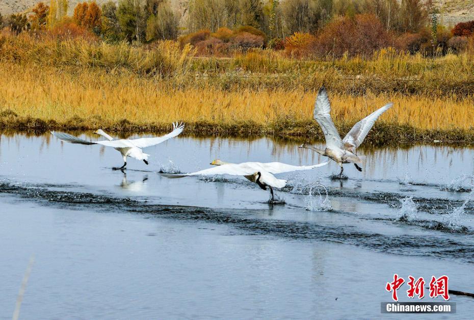 秋の景色をバックに水辺で戯れる白鳥(niǎo)の群れ