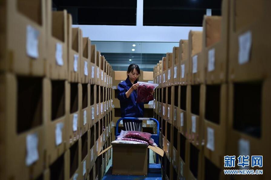 10月27日、河北省■(刑のへんにおおざと)臺市清河県のカシミア製品メーカーで、配貨擔當者の邱曙光さんが倉庫で仕分け作業(yè)をしているところ。ダブル11が近づき、各地の企業(yè)はこのビジネスチャンスに焦點を合わせ、生産、営業(yè)販売、物流など各段階での戦いに備えて準備をし、まもなくやって來るネット通販の熱い波を待ち受けている。