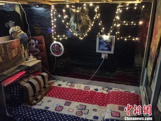 寮の部屋のあるベッドのそばには黃色のライトが吊るされ、アーティスティックな雰囲気を漂わせている(撮影?王秋蘭)。