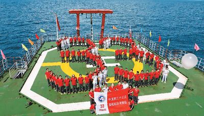 中國第33次南極科學(xué)観測隊(duì)が乗る極地観測船「雪竜號(hào)」は7日間の航行を経て、北から南へと赤道を通過し、南半球の航行を開始した。中國第33次南極科學(xué)観測隊(duì)員と「雪竜號(hào)」の船員が、「雪竜號(hào)」にある駐機(jī)場で「33」の人文字を作った。人民日?qǐng)?bào)海外版が伝えた。(編集YF)