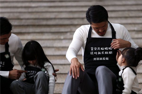 在“給媽媽放假”行為藝術(shù)現(xiàn)場,20個可愛呆萌的小孩子牽著各自的帥爸,系著平時只有媽媽們常穿的圍裙,手拉著手,用圍裙上的話向媽媽們甜蜜“表白”。每個圍裙上都有一句話,講述媽媽們平時帶孩子的辛苦,向她們表示感激。