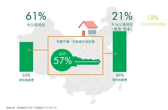 調(diào)査の結(jié)果、中國(guó)では、「ミレニアム世代」が両親と同居している割合が比較的高く、また、今後マイホームを所有したいという強(qiáng)い意欲を持っている人が過半數(shù)を占めていることが明らかになった。結(jié)婚するまでは両親と同居するという文化的習(xí)慣のほか、不動(dòng)産価格が高騰し続けている狀況も、その主な原因となっている。だが、回答者の半數(shù)近くは、「今後2年以內(nèi)に実家から出る予定」としている。また、現(xiàn)在両親と同居している、または実家を出て賃貸住まいをしているかに関わらず、回答者の57%は、「今後、マイホームの購入を考えている」と答えた。この割合はアジアでトップだった。