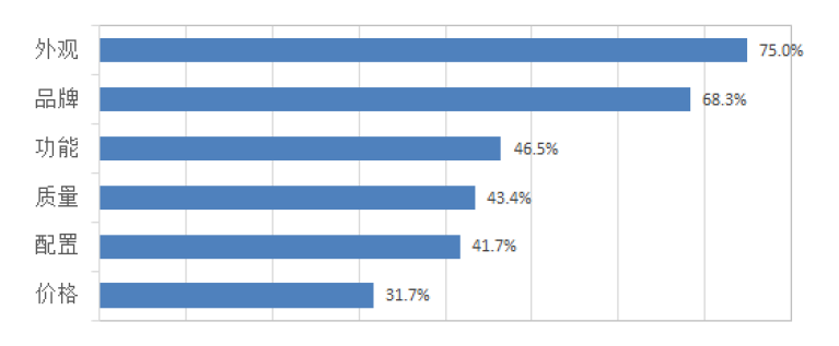 同報告によると、消費者が言及している主な內(nèi)容はブランド、スペック、機(jī)能、品質(zhì)、外観、価格など。うち、最も重視しているのが外観で75%。以下、ブランド、機(jī)能、品質(zhì)、スペック、価格と続いた。