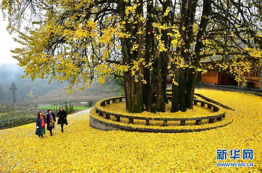 初冬になり、湖北省恩施土家族苗族(ミャオ族)自治州宣恩県珠山鎮(zhèn)茅■(■はつちへんに貝)塘村にある樹(shù)齢1500歳あまりの銀杏の木が「金色の季節(jié)」を迎えた。落ち葉が樹(shù)下に散り敷いた様子はさながら「黃金の絨毯」で、大勢(shì)の観光客が古木の風(fēng)情を見(jiàn)にこの地を訪(fǎng)れている。この銀杏は親株の周?chē)欷摔郡丹螭蚊妊繋证?、子株や枝が放射狀に広がる。まるで「多世代同堂」で、幾世代もの枝葉が集まって巨木となり、「9人の子供が母親を抱きかかえる」ような様子をしており、幹の中の空洞部分には人が10人ほど入れるという。新華網(wǎng)が伝えた。(編集KS)