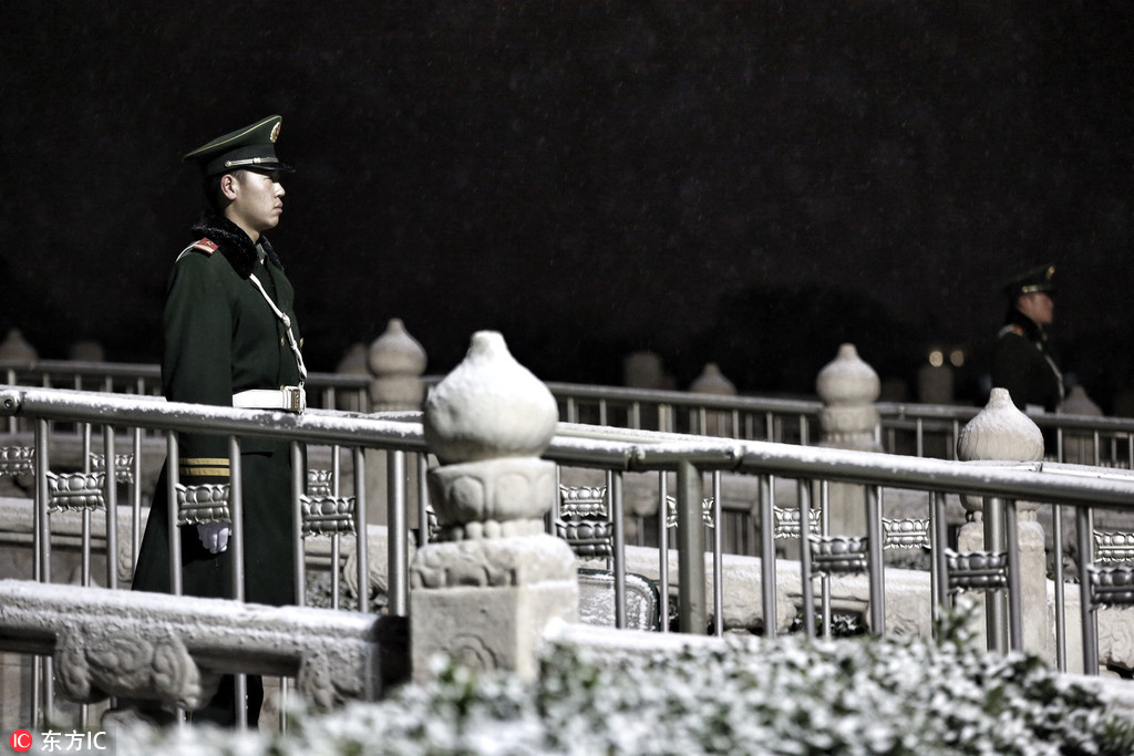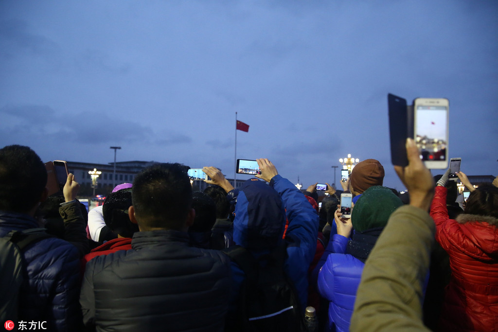 北京で初雪観測(cè)、降雪のなか天安門(mén)の國(guó)旗掲揚(yáng)に集まる観光客たち