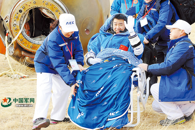 その後、白地の宇宙飛行服を身につけた景海鵬氏と陳冬氏が帰還モジュールから一人ずつ出てきた。彼らはいずれも笑顔を浮かべ、手をふって人々に挨拶した。
