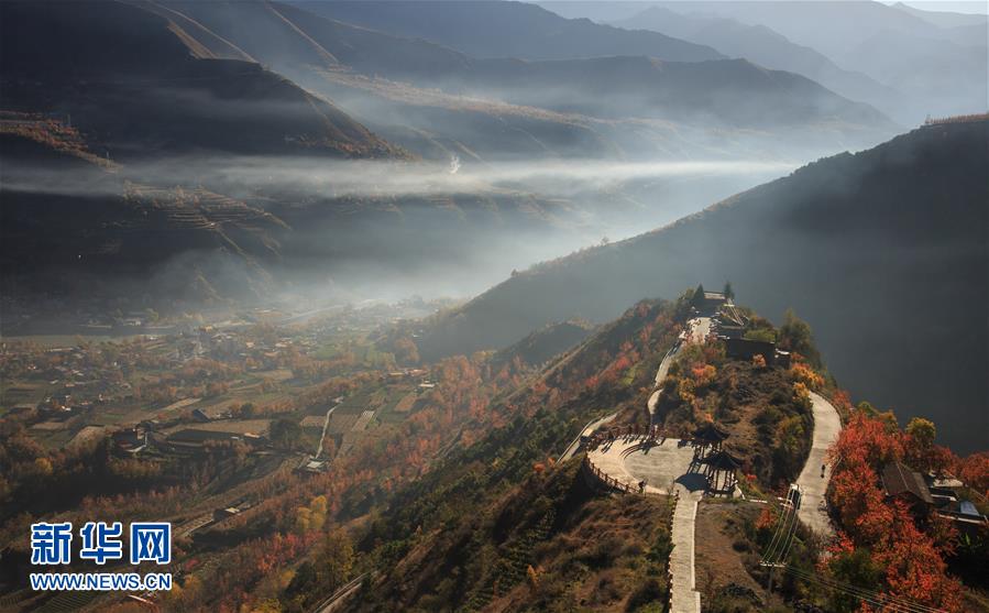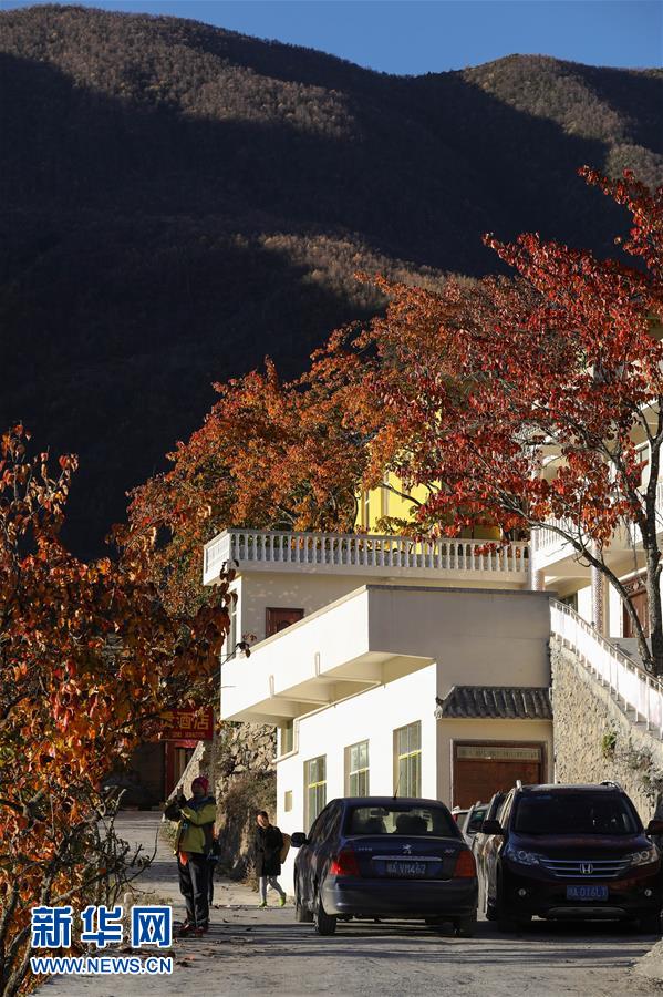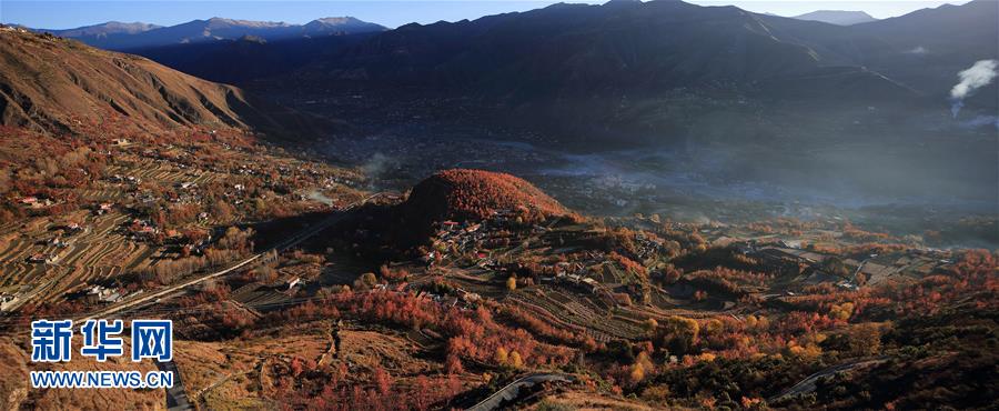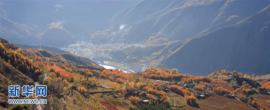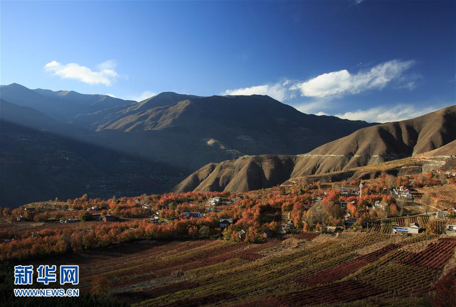 四川省金川県勒烏郷馬厰村の田畑は赤く染まったナシの木の葉やブドウの葉で覆われていた。毎年11月になると同省大渡河谷の金川県一帯は、山全體が秋の裝いにつつまれ、木々の鮮やかな彩が広がる。寫真は秋の彩りに染まる大渡河谷一帯の様子(撮影?江宏景)。新華社が伝えた。(編集TG)