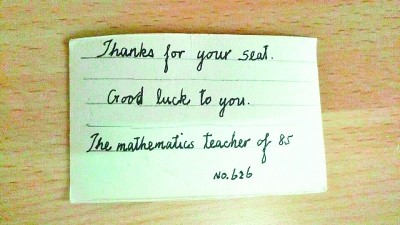 武漢科技大學(xué)のマテリアル?冶金學(xué)院の一年生である王迪さんはこのほど微信のモーメンツに「あるお年寄りに席を譲ったら、感謝のカードをもらっただけでなく、高等數(shù)學(xué)の補(bǔ)習(xí)までしてもらった。まさに『バラは彼女の手に、香りは私のもとに』という言葉そのもの!」というコメントと共に、英語(yǔ)で手書きされた感謝のカードを掲載し、多くの人から「いいね!」が寄せられている。武漢晩報(bào)が伝えた。
