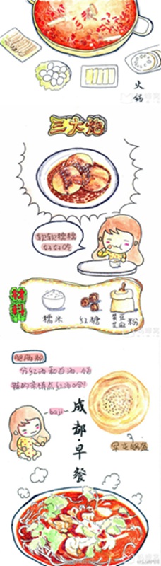 この「グルメマップ」を描いたのは、微博(ウェイボー)ユーザーの「maggie瓊叨叨」さん。Q版(ちびキャラ)の狼牙土豆(四川風(fēng)フライドポテト)、串串香(串揚(yáng)げ)、豆花(豆腐スィーツ)、粉蒸肉(スペアリブ)、抄手(ワンタン)、涼粉(ところてん)、鐘水餃(ピリ辛餃子スープ)などのさまざまな料理や、各店の外裝?住所?電話?支払方法などの情報(bào)が全て示されており、とても便利だ。あるネットユーザーは、「美味しいものを食べ終わって絵を描くことができる人もいるけど、私は食べればただ太るだけ。この差は大きい!」とコメントした。(編集KM)