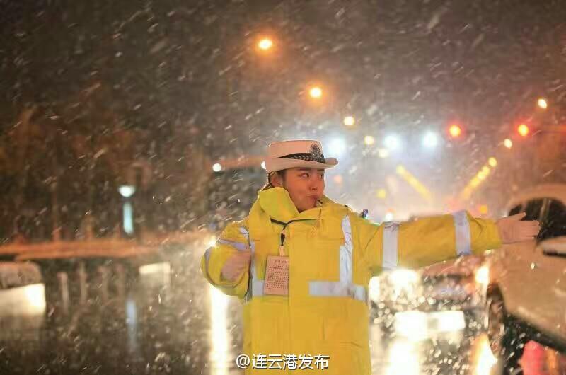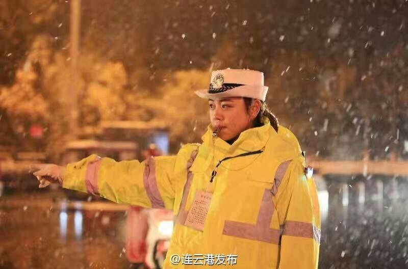 江蘇省連雲(yún)港市では初雪が降り、11月22日の午後から夜にかけての帰宅ラッシュ時も大雪が降り続いていた。しかし、そんな悪天候でも、連雲(yún)港交通警察海州一大隊女子中隊の女性交通警察官?隴海崗さんはずっと自分の持ち場に立ち続け、交通整理を行っていた。寫真は連雲(yún)港市人民政府の公式微博(ウェイボー)より転載。(編集YK)