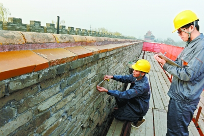 西華門の北側(cè)にある故宮城壁の破損狀況について調(diào)査?測量を行う作業(yè)員たち