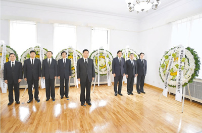 習(xí)主席、李克強(qiáng)総理、張徳江全人代常務(wù)委員會(huì)委員長(zhǎng)、兪正聲全國(guó)政協(xié)主席、江沢民氏、胡錦濤氏が獻(xiàn)花した。