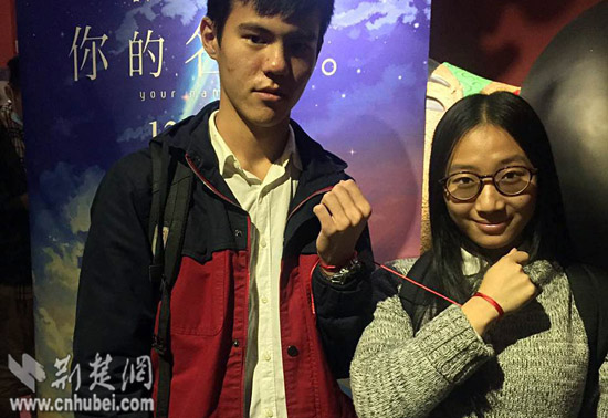 従來(lái)の映畫鑑賞とは異なり、劇場(chǎng)に來(lái)た多くの人たちが制服を著てこの青春映畫を見に來(lái)ていた。また、女主人公の三葉がつけている赤い組紐を真似て、親友、兄弟、ルームメート、親子、カップルが髪やお互いの腕を赤い紐で結(jié)ぶ姿が多く見られた。映畫「君の名前は?!工摔い啤⒊啶そM紐は、瀧と三葉の運(yùn)命を繋ぐ「運(yùn)命の赤い糸」として描かれており、人々の絆の象徴にもなっているといえる。寫真は李柯佳提供。