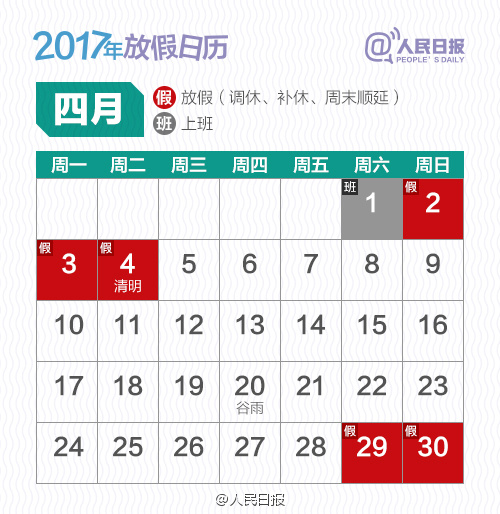三、清明節(jié):4月2日から4日までの3日間を連休とする。4月1日(土)は振替出勤日。