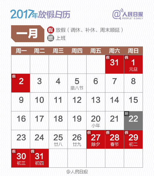 通知によると、國務(wù)院の批準を経て、2017年元旦、春節(jié)(舊正月)、清明節(jié)、労働節(jié)(メーデー、5月1日)、端午節(jié)、中秋節(jié)、國慶節(jié)(建國記念日、10月1日)の具體的な日程が次の通り定められた。