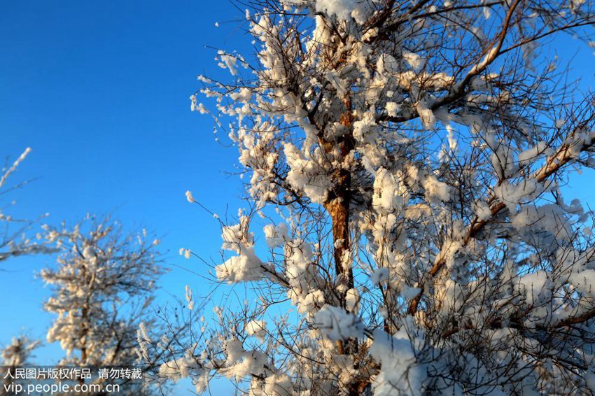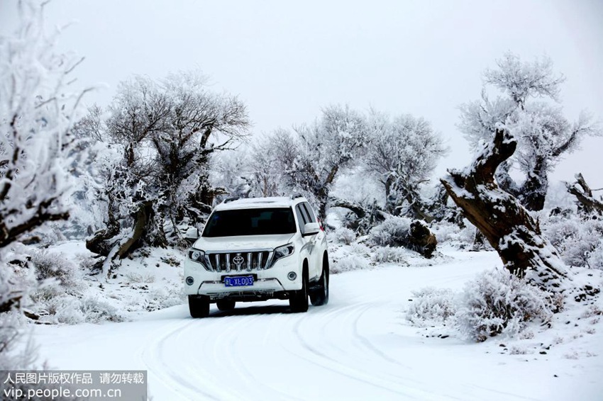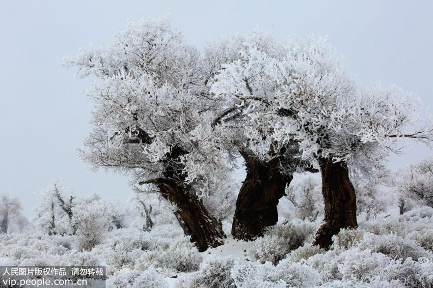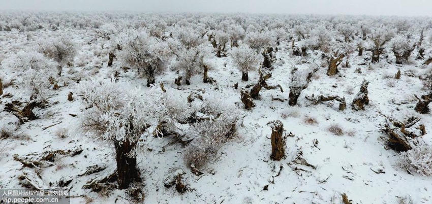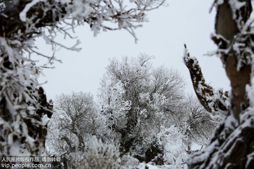 新疆維吾爾(ウイグル)自治區(qū)哈密(クムル)市のコトカケヤナギ観光風(fēng)景區(qū)內(nèi)は、冬になると雪が積もり、一面銀世界となる。コトカケヤナギにも雪の華が満開となり、水墨畫のような息をのむような美しい風(fēng)景となるため、多くの観光客が押し寄せる。(編集KN)