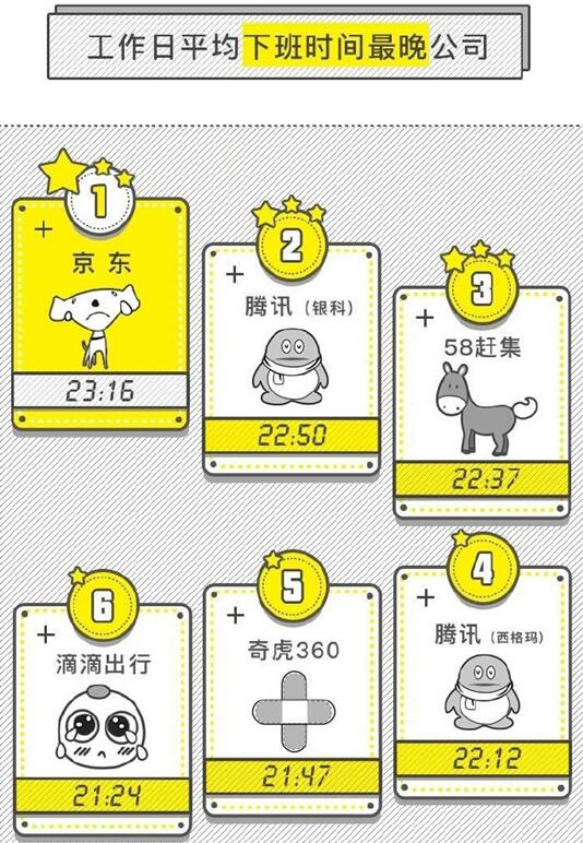 平日の退社時間が最もおそい會社ランキングトップの京東の平均退社時間は午後11時16分。以下、騰訊(盈科)、58趕集、騰訊(西格瑪)、奇虎360、滴滴出行、優(yōu)酷土豆、搜狐、愛奇蕓、新美大、新浪、百度と続き、いずれも午後8時以降だった。
