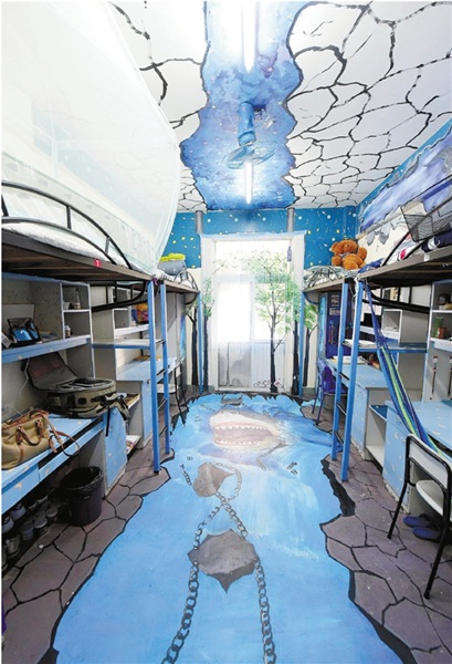 天井には銀河に瞬く満天の星、床には今にも海面から飛びかかってきそうなジョーズ。浙江紡織服裝學(xué)院の生徒?陳先権さんが手がけた學(xué)生寮の內(nèi)裝が個(gè)性的でかっこいいと最近ネットユーザーたちの間で稱賛を集めている。あるネットユーザーなどは「この部屋と比べると、自分の部屋は豚小屋みたい」とコメントしている。銭江晩報(bào)が伝えた。